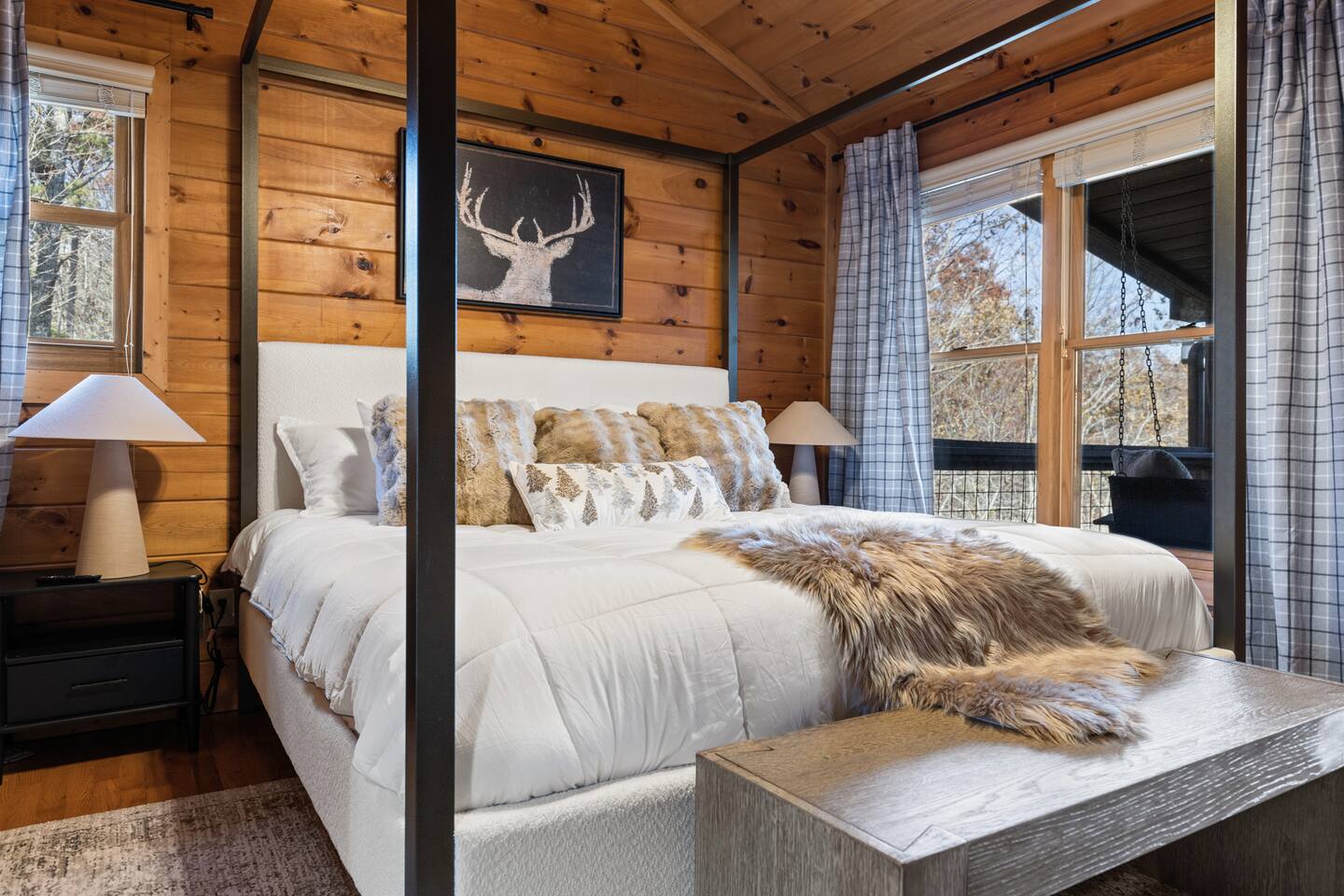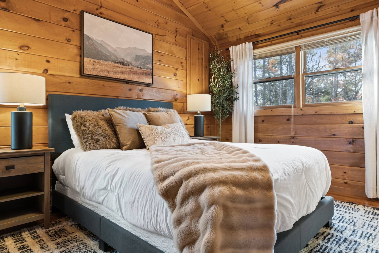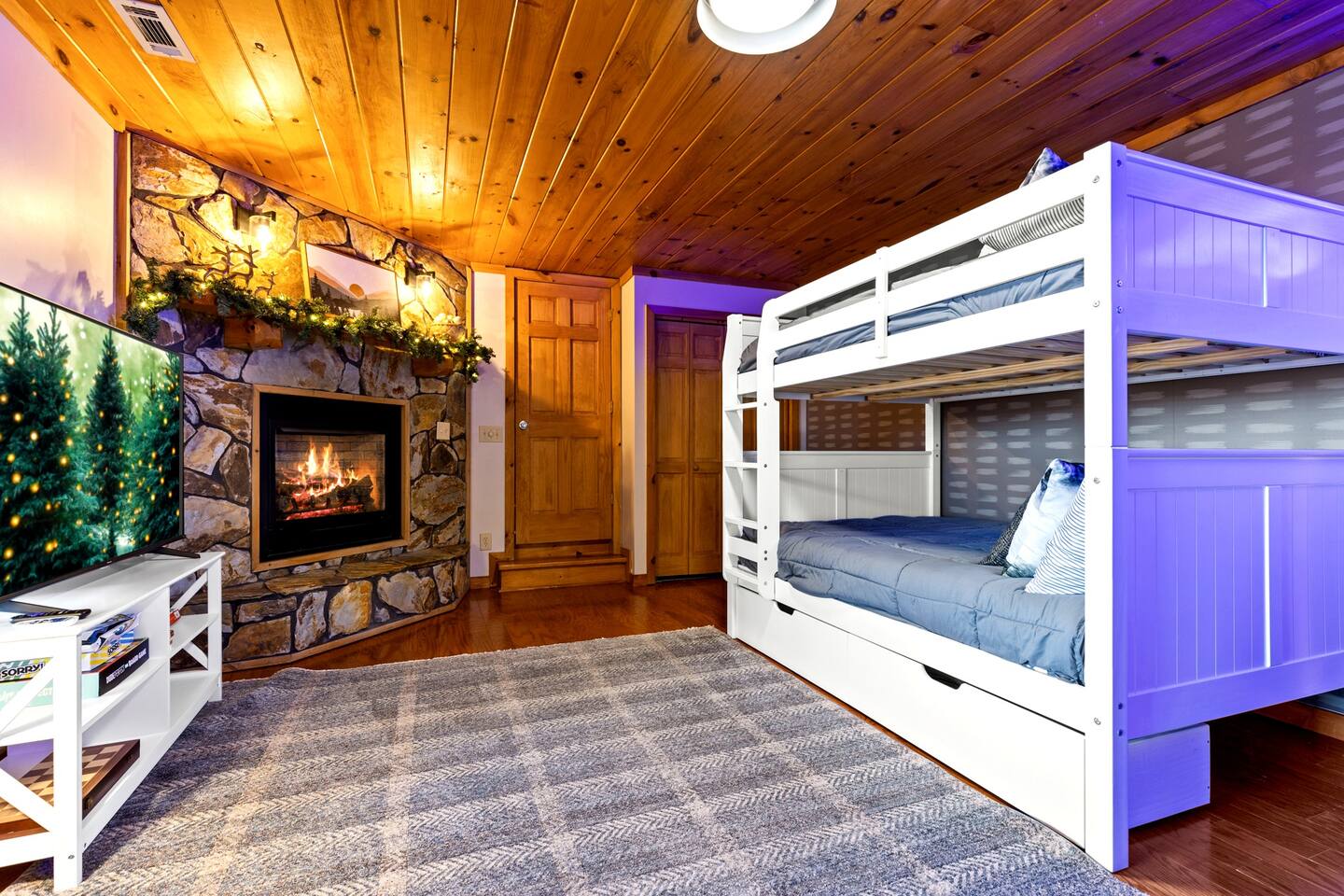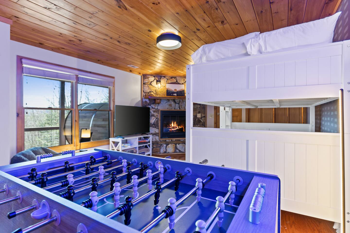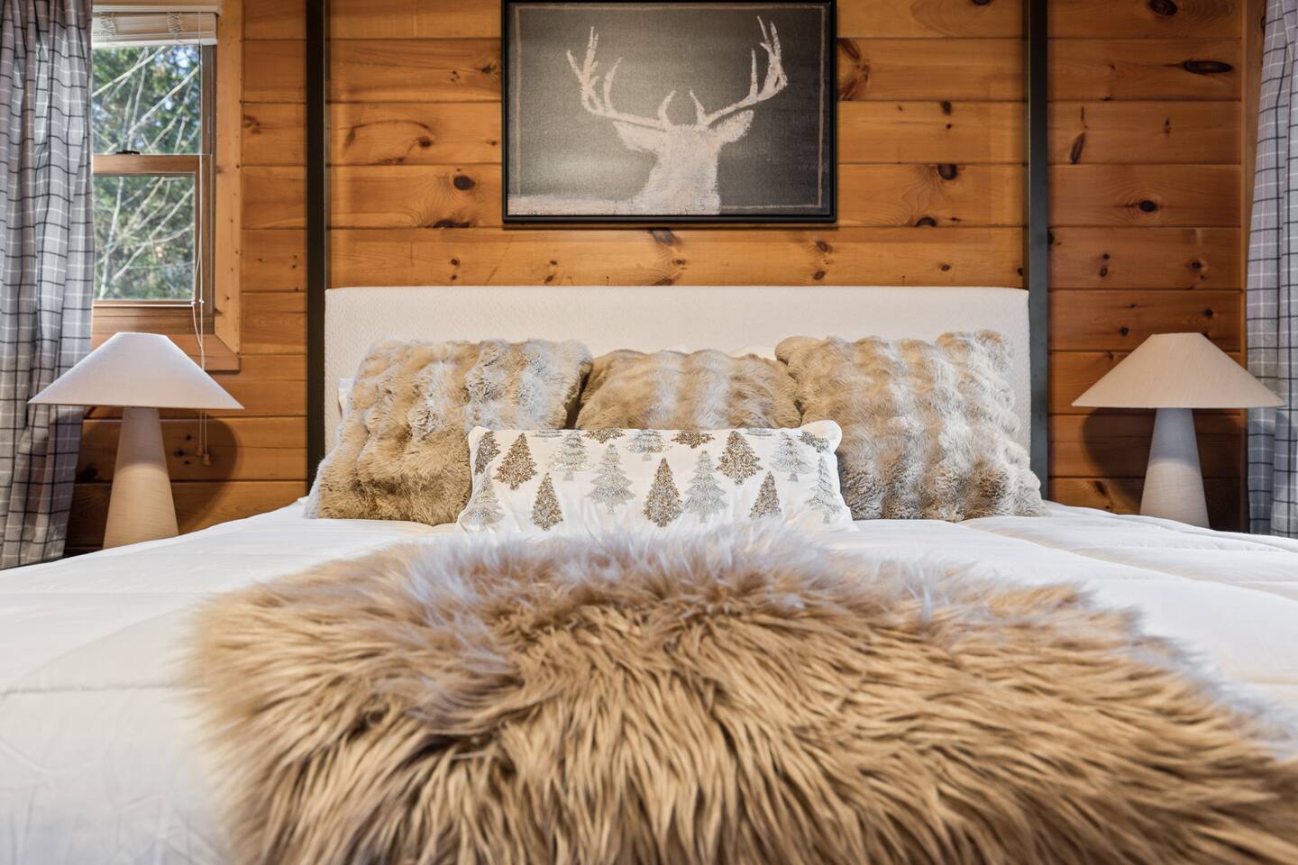 The Antler Lodge is a luxury cabin retreat nestled in the heart of nature, surrounded by trees and perched on a mountainside with breathtaking views. The cabin is a perfect blend of rustic charm and modern elegance, featuring large floor-to-ceiling windows that bring the outdoors in, flooding the space with natural light. -The cabin has an open-concept living area with a stone fireplace, 65” Smart TV, plush furnishings, and warm wood accents that create an inviting atmosphere. -The gourmet kitchen is fully equipped and has an intimate space for dining while providing bar space for additional seating. It is fully equipped with all the essential appliances and utensils you need for a seamless cooking experience. Whether you’re preparing a gourmet meal or a quick snack, you’ll find: ✔ High-quality appliances, including a refrigerator, stove, oven, microwave, and dishwasher. ✔ Small appliances like a coffee maker, toaster, blender, and crock pot for added convenience. ✔ Cookware & bakeware, including pots, pans, baking sheets, and casserole dishes. ✔ Utensils & cutlery, such as knives, spatulas, ladles, and serving spoons. ✔ Dinnerware & glassware, including plates, bowls, mugs, and wine glasses ✔ Basic pantry essentials, like salt, pepper, cooking oil and spices. With everything at your fingertips, you can enjoy home-cooked meals in a stunning setting—whether you’re dining inside or enjoying an alfresco meal on the deck with spectacular views. -Bedroom 1 is a luxurious retreat, featuring a plush king-size bed dressed in luxury linens for a restful night’s sleep. A flat-screen smart TV is mounted for cozy movie nights in bed, while a dresser and closet provide storage for your belongings. The room also boasts a private en-suite bathroom, offering added comfort and convenience with a shower and premium toiletries. Step out onto the upper deck and enjoy watching the sun rise while sipping coffee in the morning. This serene space is designed for both relaxation and indulgence, making it the perfect personal sanctuary within the cabin. -Bedroom 2 offers a cozy yet elegant retreat, featuring a queen-size bed adorned with luxury linens for a blissful night’s sleep. A flat-screen TV is mounted for entertainment, allowing guests to unwind in comfort. The room also includes a private en-suite bathroom. -Bedroom 3 is the ultimate fun zone, perfect for kids and teens—or even the young at heart! This room features full-size bunk beds. A flat-screen TV provides entertainment, while the room truly shines with its board games, arcade games and foosball table, creating an exciting game room vibe. To complete the space, a custom neon sign adds a cool, modern touch, making it the perfect hangout spot for late-night gaming, movies, and unforgettable memories. -This luxury cabin is designed for both relaxation and productivity, featuring a cozy reading nook and a dedicated workspace for remote work. Featuring a plush armchair this space is the perfect spot to unwind with a good book and a warm cup of coffee. A comfortable workstation equipped with a desk, lamp, comfortable chair, and high-speed WiFi, make it easy to stay connected. All while the peaceful cabin atmosphere fosters focus and creativity. -The upper deck offers a perfect blend of comfort and ambiance, with two thoughtfully designed seating areas that invite guests to relax and take in the breathtaking views. Cozy Fire Table Lounge – This seating area features a stylish wicker sofa set, providing plush comfort as guests gather around the elegant fire table. Whether enjoying a morning coffee or an evening cocktail, the warm glow of the fire creates an inviting atmosphere for conversation and relaxation. Scenic Swing & Rocking Chair Retreat – On the other side of the deck, a porch swing and 2 rocking chairs offer a peaceful escape. Perfect for enjoying a book, sipping a glass of wine, or simply soaking in the tranquil surroundings, this space captures the essence of mountain serenity. -For relaxation, step into the private sauna, where the warmth soothes your muscles after a day of adventure. Outside, a steaming hot tub awaits on the deck, offering a perfect spot to unwind while soaking in the stunning views—whether it’s a sunset over the mountains or a starlit sky. The fire pit area provides an idyllic setting for cozy evenings, where you can roast marshmallows, sip wine, and share stories by the crackling fire. Head to the outdoors for fun and relaxation, featuring a variety of exciting games to enjoy in the fresh air. Guests can challenge each other to a friendly match of Giant Jenga, test their strategy with Giant Connect 4, or show off their tossing skills in a game of Corn Hole. These classic outdoor games create the perfect setting for laughter, competition, and unforgettable moments, whether you're spending time with family or friends. Every corner of this luxurious escape is designed for ultimate comfort, privacy, and relaxation—whether you’re looking for a romantic getaway, a family vacation, or a weekend retreat with friends. This is luxury in the wilderness at its finest