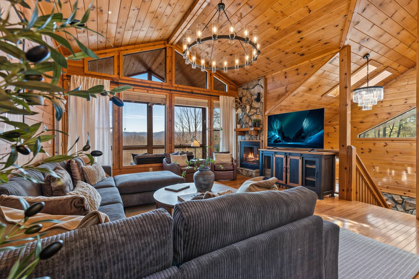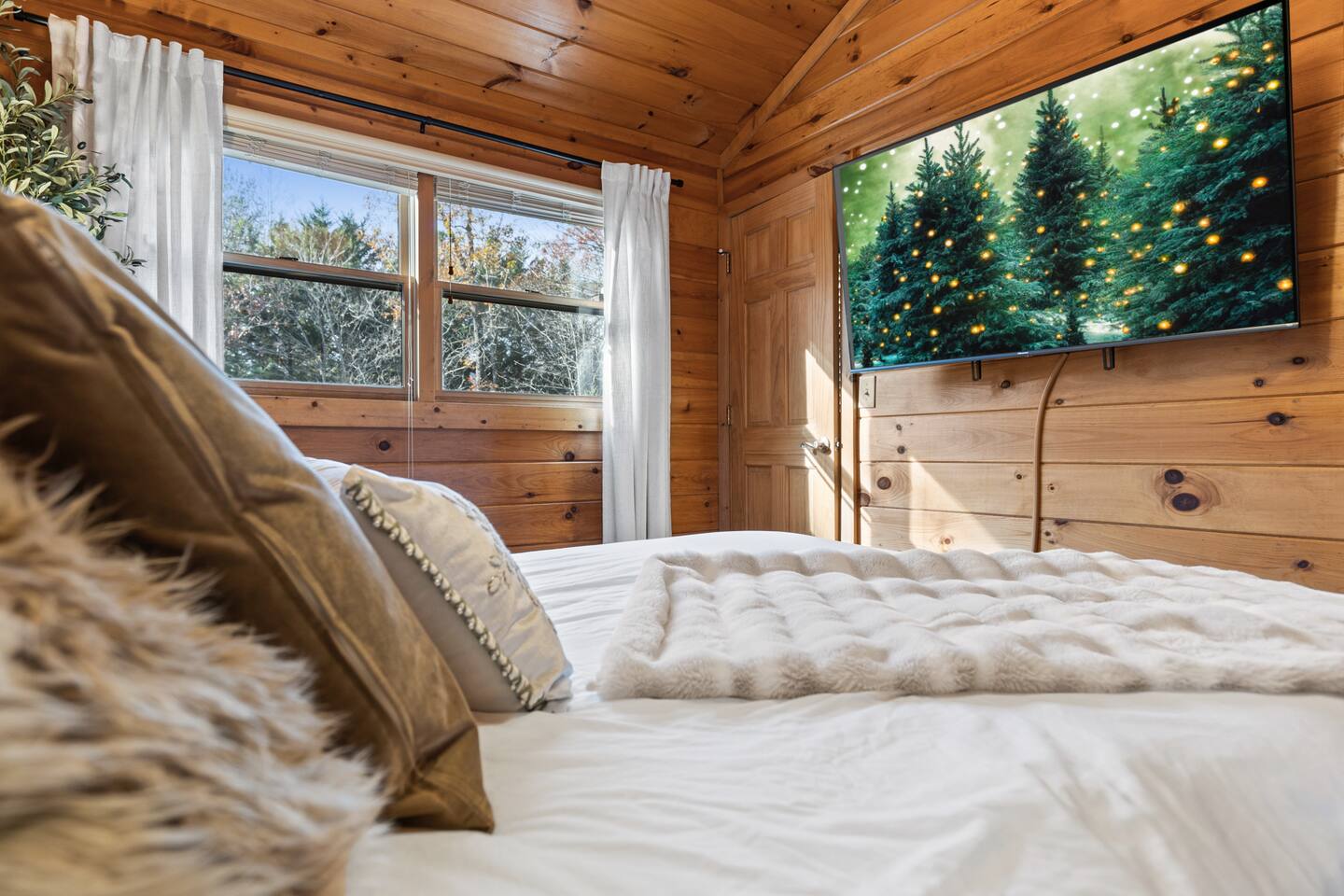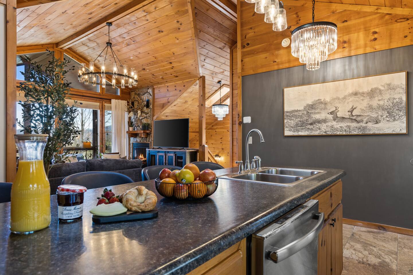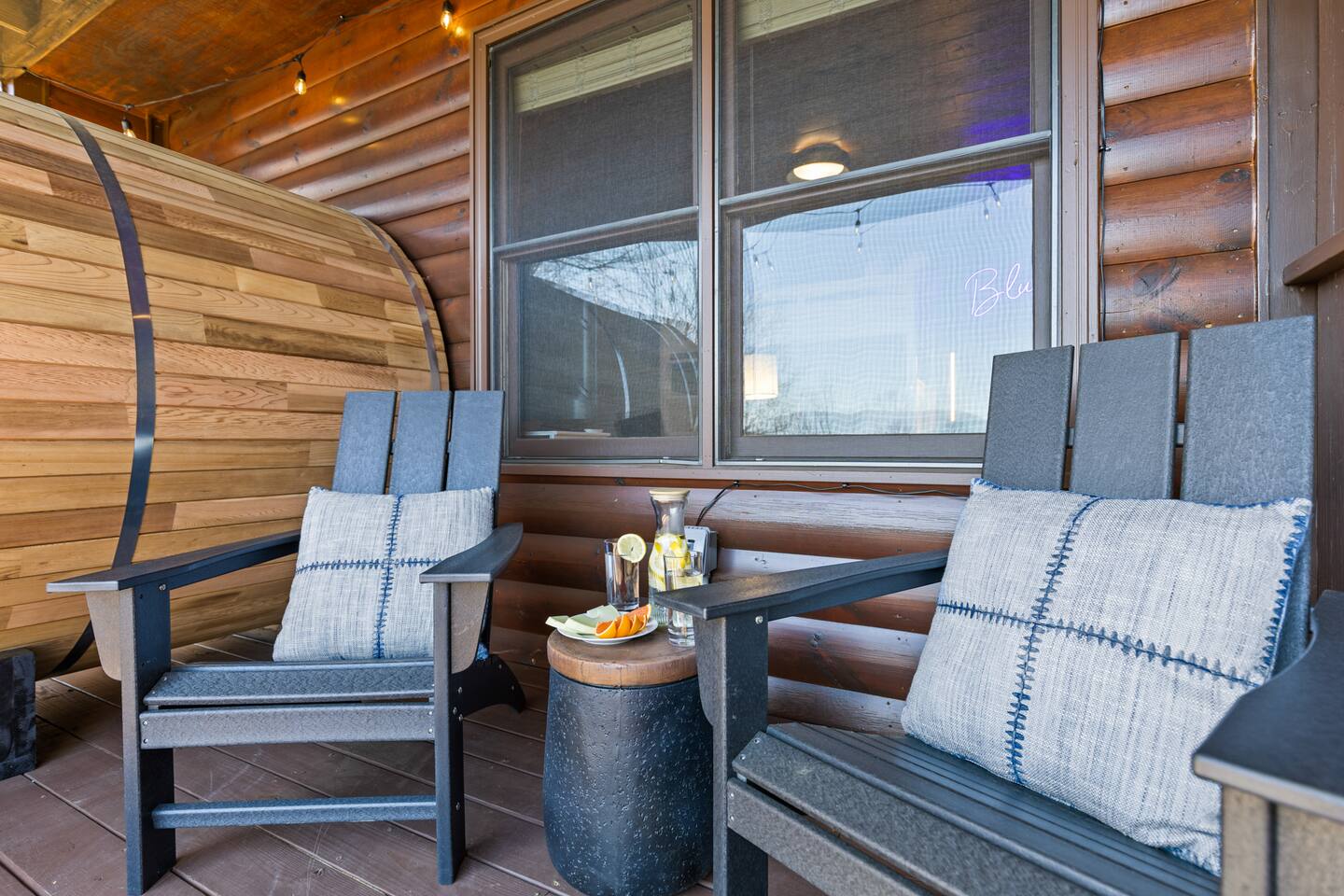 The Antler Lodge is a luxury cabin retreat nestled in the heart of nature, surrounded by trees and perched on a mountainside with breathtaking views. The cabin is a perfect blend of rustic charm and modern elegance, featuring large floor-to-ceiling windows that bring the outdoors in, flooding the space with natural light. -The cabin has an open-concept living area with a stone fireplace, 65” Smart TV, plush furnishings, and warm wood accents that create an inviting atmosphere. -The gourmet kitchen is fully equipped and has an intimate space for dining while providing bar space for additional seating. It is fully equipped with all the essential appliances and utensils you need for a seamless cooking experience. Whether you’re preparing a gourmet meal or a quick snack, you’ll find: ✔ High-quality appliances, including a refrigerator, stove, oven, microwave, and dishwasher. ✔ Small appliances like a coffee maker, toaster, blender, and crock pot for added convenience. ✔ Cookware & bakeware, including pots, pans, baking sheets, and casserole dishes. ✔ Utensils & cutlery, such as knives, spatulas, ladles, and serving spoons. ✔ Dinnerware & glassware, including plates, bowls, mugs, and wine glasses ✔ Basic pantry essentials, like salt, pepper, cooking oil and spices. With everything at your fingertips, you can enjoy home-cooked meals in a stunning setting—whether you’re dining inside or enjoying an alfresco meal on the deck with spectacular views. -Bedroom 1 is a luxurious retreat, featuring a plush king-size bed dressed in luxury linens for a restful night’s sleep. A flat-screen smart TV is mounted for cozy movie nights in bed, while a dresser and closet provide storage for your belongings. The room also boasts a private en-suite bathroom, offering added comfort and convenience with a shower and premium toiletries. Step out onto the upper deck and enjoy watching the sun rise while sipping coffee in the morning. This serene space is designed for both relaxation and indulgence, making it the perfect personal sanctuary within the cabin. -Bedroom 2 offers a cozy yet elegant retreat, featuring a queen-size bed adorned with luxury linens for a blissful night’s sleep. A flat-screen TV is mounted for entertainment, allowing guests to unwind in comfort. The room also includes a private en-suite bathroom. -Bedroom 3 is the ultimate fun zone, perfect for kids and teens—or even the young at heart! This room features full-size bunk beds. A flat-screen TV provides entertainment, while the room truly shines with its board games, arcade games and foosball table, creating an exciting game room vibe. To complete the space, a custom neon sign adds a cool, modern touch, making it the perfect hangout spot for late-night gaming, movies, and unforgettable memories. -This luxury cabin is designed for both relaxation and productivity, featuring a cozy reading nook and a dedicated workspace for remote work. Featuring a plush armchair this space is the perfect spot to unwind with a good book and a warm cup of coffee. A comfortable workstation equipped with a desk, lamp, comfortable chair, and high-speed WiFi, make it easy to stay connected. All while the peaceful cabin atmosphere fosters focus and creativity. -The upper deck offers a perfect blend of comfort and ambiance, with two thoughtfully designed seating areas that invite guests to relax and take in the breathtaking views. Cozy Fire Table Lounge – This seating area features a stylish wicker sofa set, providing plush comfort as guests gather around the elegant fire table. Whether enjoying a morning coffee or an evening cocktail, the warm glow of the fire creates an inviting atmosphere for conversation and relaxation. Scenic Swing & Rocking Chair Retreat – On the other side of the deck, a porch swing and 2 rocking chairs offer a peaceful escape. Perfect for enjoying a book, sipping a glass of wine, or simply soaking in the tranquil surroundings, this space captures the essence of mountain serenity. -For relaxation, step into the private sauna, where the warmth soothes your muscles after a day of adventure. Outside, a steaming hot tub awaits on the deck, offering a perfect spot to unwind while soaking in the stunning views—whether it’s a sunset over the mountains or a starlit sky. The fire pit area provides an idyllic setting for cozy evenings, where you can roast marshmallows, sip wine, and share stories by the crackling fire. Head to the outdoors for fun and relaxation, featuring a variety of exciting games to enjoy in the fresh air. Guests can challenge each other to a friendly match of Giant Jenga, test their strategy with Giant Connect 4, or show off their tossing skills in a game of Corn Hole. These classic outdoor games create the perfect setting for laughter, competition, and unforgettable moments, whether you're spending time with family or friends. Every corner of this luxurious escape is designed for ultimate comfort, privacy, and relaxation—whether you’re looking for a romantic getaway, a family vacation, or a weekend retreat with friends. This is luxury in the wilderness at its finest
