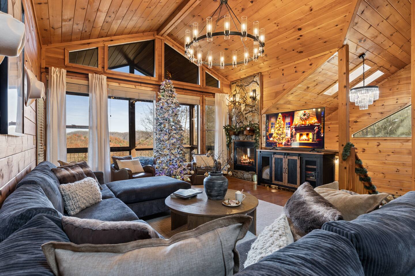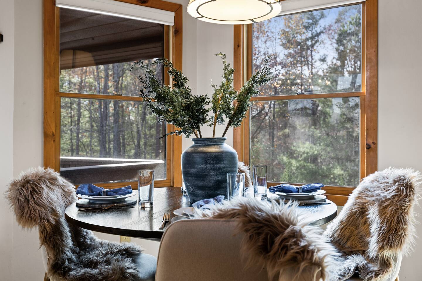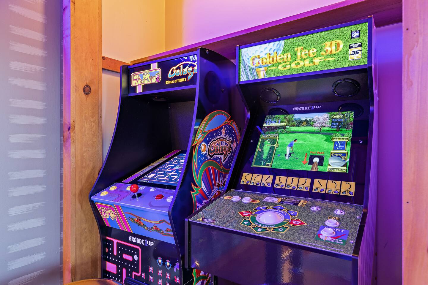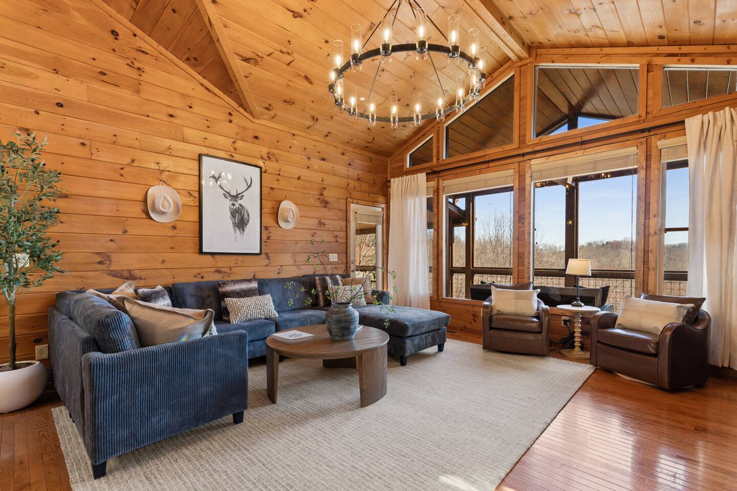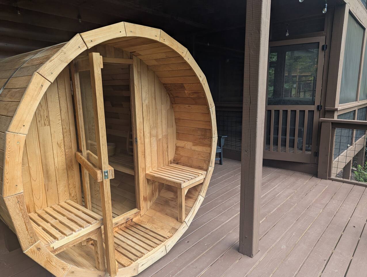 The Antler Lodge is a luxury cabin retreat nestled in the heart of nature, surrounded by trees and perched on a mountainside with breathtaking views. The cabin is a perfect blend of rustic charm and modern elegance, featuring large floor-to-ceiling windows that bring the outdoors in, flooding the space with natural light. -The cabin has an open-concept living area with a stone fireplace, 65” Smart TV, plush furnishings, and warm wood accents that create an inviting atmosphere. -The gourmet kitchen is fully equipped and has an intimate space for dining while providing bar space for additional seating. It is fully equipped with all the essential appliances and utensils you need for a seamless cooking experience. Whether you’re preparing a gourmet meal or a quick snack, you’ll find: ✔ High-quality appliances, including a refrigerator, stove, oven, microwave, and dishwasher. ✔ Small appliances like a coffee maker, toaster, blender, and crock pot for added convenience. ✔ Cookware & bakeware, including pots, pans, baking sheets, and casserole dishes. ✔ Utensils & cutlery, such as knives, spatulas, ladles, and serving spoons. ✔ Dinnerware & glassware, including plates, bowls, mugs, and wine glasses ✔ Basic pantry essentials, like salt, pepper, cooking oil and spices. With everything at your fingertips, you can enjoy home-cooked meals in a stunning setting—whether you’re dining inside or enjoying an alfresco meal on the deck with spectacular views. -Bedroom 1 is a luxurious retreat, featuring a plush king-size bed dressed in luxury linens for a restful night’s sleep. A flat-screen smart TV is mounted for cozy movie nights in bed, while a dresser and closet provide storage for your belongings. The room also boasts a private en-suite bathroom, offering added comfort and convenience with a shower and premium toiletries. Step out onto the upper deck and enjoy watching the sun rise while sipping coffee in the morning. This serene space is designed for both relaxation and indulgence, making it the perfect personal sanctuary within the cabin. -Bedroom 2 offers a cozy yet elegant retreat, featuring a queen-size bed adorned with luxury linens for a blissful night’s sleep. A flat-screen TV is mounted for entertainment, allowing guests to unwind in comfort. The room also includes a private en-suite bathroom. -Bedroom 3 is the ultimate fun zone, perfect for kids and teens—or even the young at heart! This room features full-size bunk beds. A flat-screen TV provides entertainment, while the room truly shines with its board games, arcade games and foosball table, creating an exciting game room vibe. To complete the space, a custom neon sign adds a cool, modern touch, making it the perfect hangout spot for late-night gaming, movies, and unforgettable memories. -This luxury cabin is designed for both relaxation and productivity, featuring a cozy reading nook and a dedicated workspace for remote work. Featuring a plush armchair this space is the perfect spot to unwind with a good book and a warm cup of coffee. A comfortable workstation equipped with a desk, lamp, comfortable chair, and high-speed WiFi, make it easy to stay connected. All while the peaceful cabin atmosphere fosters focus and creativity. -The upper deck offers a perfect blend of comfort and ambiance, with two thoughtfully designed seating areas that invite guests to relax and take in the breathtaking views. Cozy Fire Table Lounge – This seating area features a stylish wicker sofa set, providing plush comfort as guests gather around the elegant fire table. Whether enjoying a morning coffee or an evening cocktail, the warm glow of the fire creates an inviting atmosphere for conversation and relaxation. Scenic Swing & Rocking Chair Retreat – On the other side of the deck, a porch swing and 2 rocking chairs offer a peaceful escape. Perfect for enjoying a book, sipping a glass of wine, or simply soaking in the tranquil surroundings, this space captures the essence of mountain serenity. -For relaxation, step into the private sauna, where the warmth soothes your muscles after a day of adventure. Outside, a steaming hot tub awaits on the deck, offering a perfect spot to unwind while soaking in the stunning views—whether it’s a sunset over the mountains or a starlit sky. The fire pit area provides an idyllic setting for cozy evenings, where you can roast marshmallows, sip wine, and share stories by the crackling fire. Head to the outdoors for fun and relaxation, featuring a variety of exciting games to enjoy in the fresh air. Guests can challenge each other to a friendly match of Giant Jenga, test their strategy with Giant Connect 4, or show off their tossing skills in a game of Corn Hole. These classic outdoor games create the perfect setting for laughter, competition, and unforgettable moments, whether you're spending time with family or friends. Every corner of this luxurious escape is designed for ultimate comfort, privacy, and relaxation—whether you’re looking for a romantic getaway, a family vacation, or a weekend retreat with friends. This is luxury in the wilderness at its finest