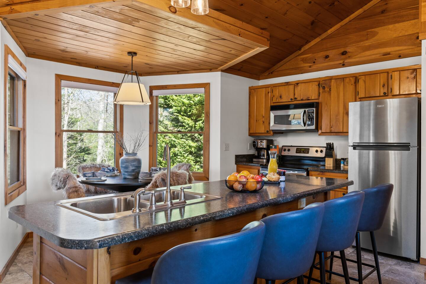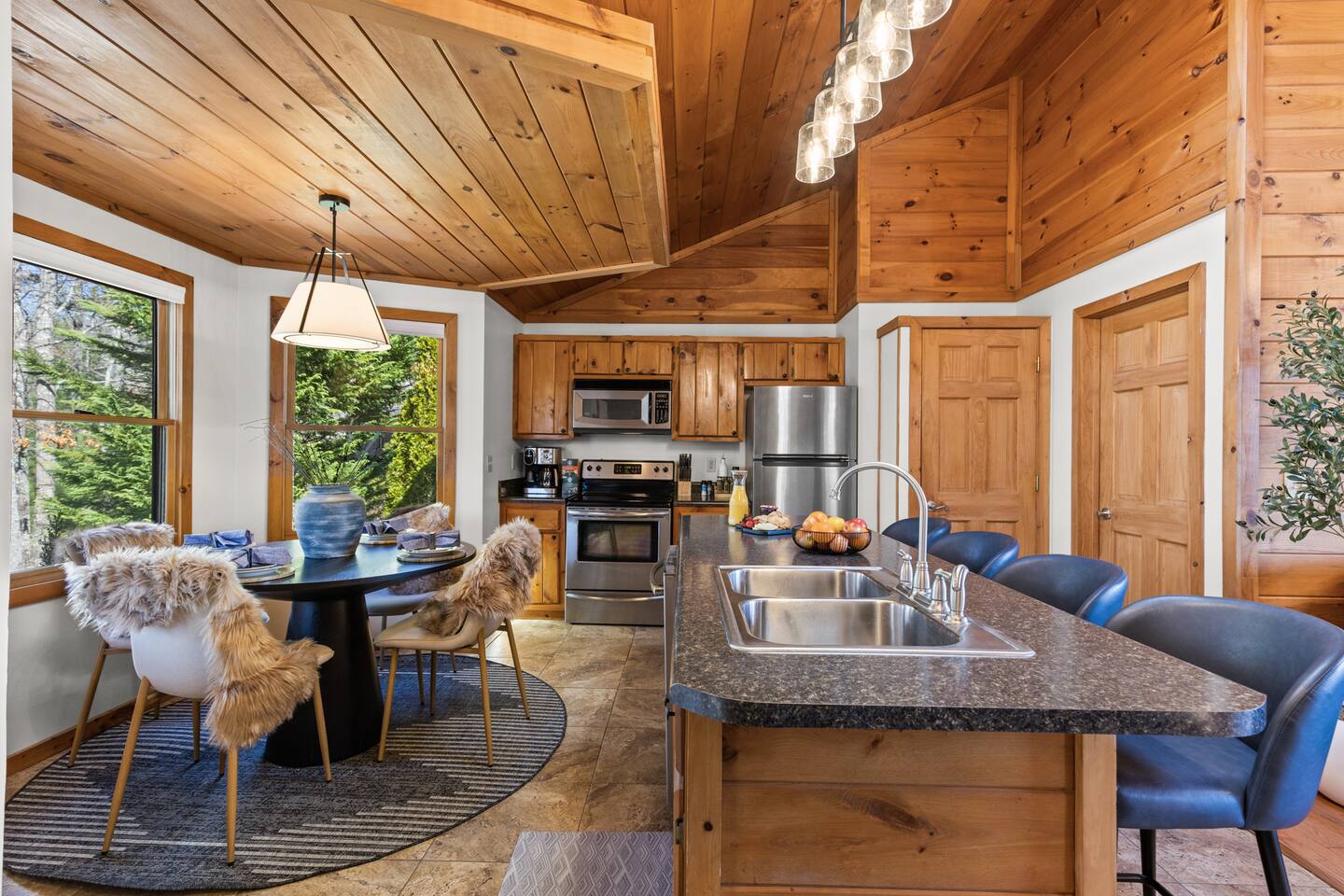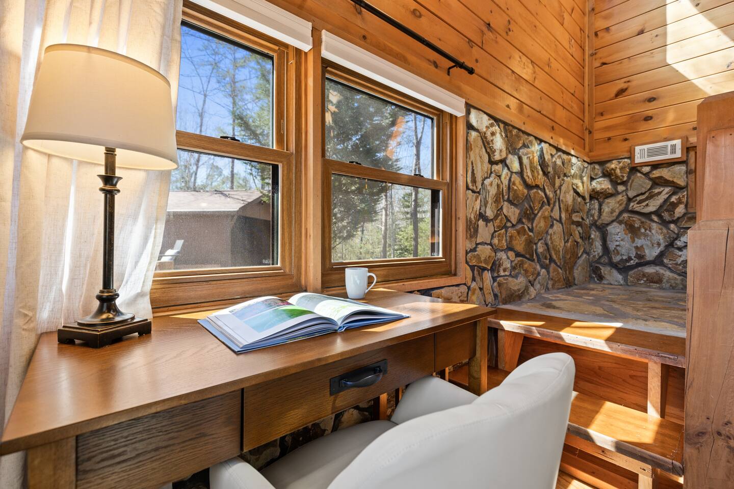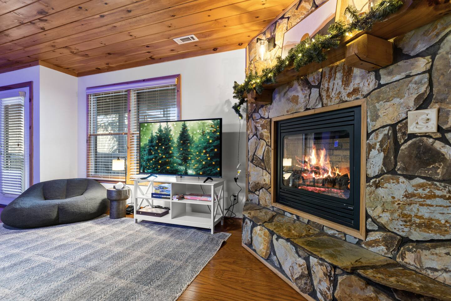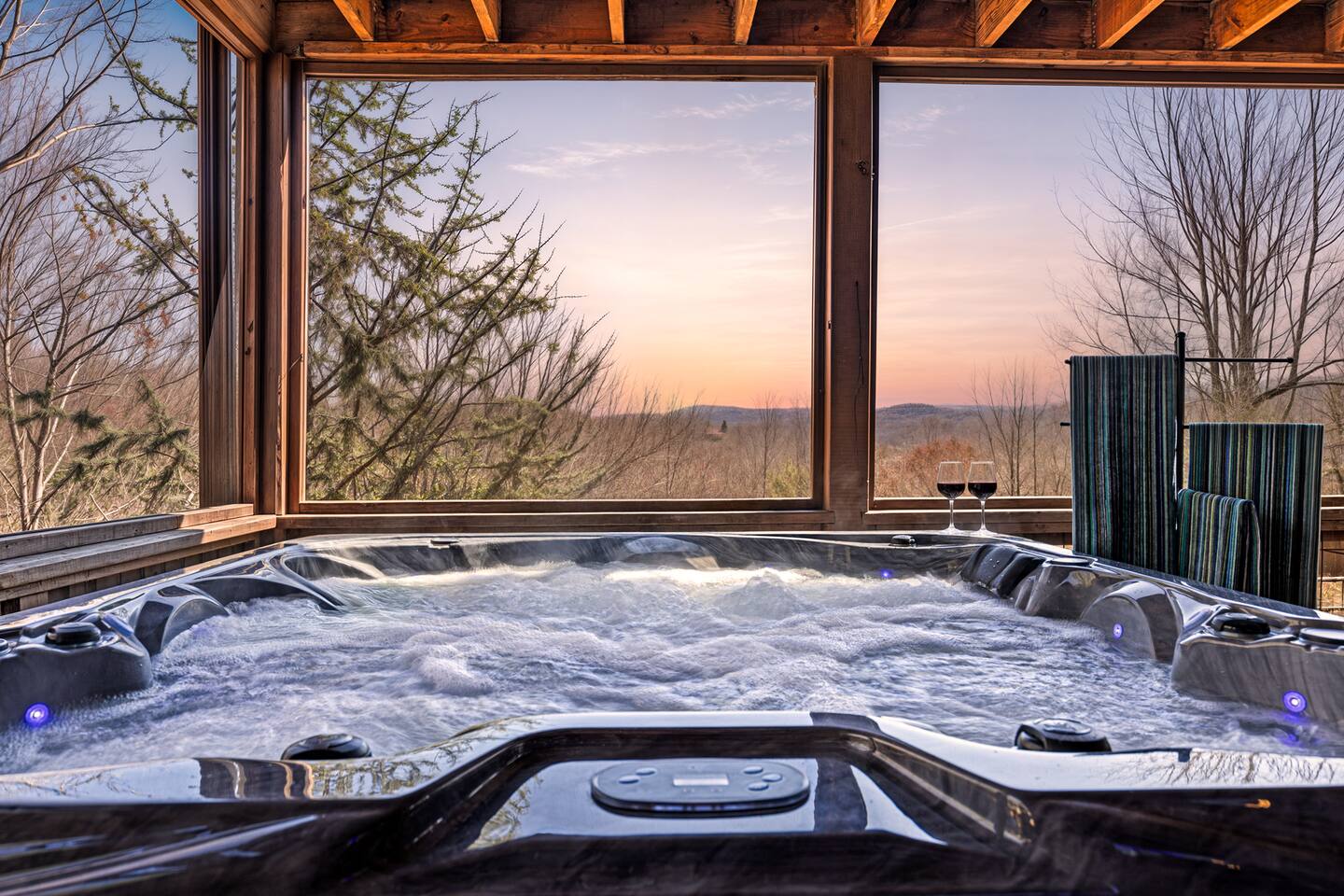The Antler Lodge is a luxury cabin retreat nestled in the heart of nature, surrounded by trees and perched on a mountainside with breathtaking views. The cabin is a perfect blend of rustic charm and modern elegance, featuring large floor-to-ceiling windows that bring the outdoors in, flooding the space with natural light. -The cabin has an open-concept living area with a stone fireplace, 65” Smart TV, plush furnishings, and warm wood accents that create an inviting atmosphere. -The gourmet kitchen is fully equipped and has an intimate space for dining while providing bar space for additional seating. It is fully equipped with all the essential appliances and utensils you need for a seamless cooking experience. Whether you’re preparing a gourmet meal or a quick snack, you’ll find: ✔ High-quality appliances, including a refrigerator, stove, oven, microwave, and dishwasher. ✔ Small appliances like a coffee maker, toaster, blender, and crock pot for added convenience. ✔ Cookware & bakeware, including pots, pans, baking sheets, and casserole dishes. ✔ Utensils & cutlery, such as knives, spatulas, ladles, and serving spoons. ✔ Dinnerware & glassware, including plates, bowls, mugs, and wine glasses ✔ Basic pantry essentials, like salt, pepper, cooking oil and spices. With everything at your fingertips, you can enjoy home-cooked meals in a stunning setting—whether you’re dining inside or enjoying an alfresco meal on the deck with spectacular views. -Bedroom 1 is a luxurious retreat, featuring a plush king-size bed dressed in luxury linens for a restful night’s sleep. A flat-screen smart TV is mounted for cozy movie nights in bed, while a dresser and closet provide storage for your belongings. The room also boasts a private en-suite bathroom, offering added comfort and convenience with a shower and premium toiletries. Step out onto the upper deck and enjoy watching the sun rise while sipping coffee in the morning. This serene space is designed for both relaxation and indulgence, making it the perfect personal sanctuary within the cabin. -Bedroom 2 offers a cozy yet elegant retreat, featuring a queen-size bed adorned with luxury linens for a blissful night’s sleep. A flat-screen TV is mounted for entertainment, allowing guests to unwind in comfort. The room also includes a private en-suite bathroom. -Bedroom 3 is the ultimate fun zone, perfect for kids and teens—or even the young at heart! This room features full-size bunk beds. A flat-screen TV provides entertainment, while the room truly shines with its board games, arcade games and foosball table, creating an exciting game room vibe. To complete the space, a custom neon sign adds a cool, modern touch, making it the perfect hangout spot for late-night gaming, movies, and unforgettable memories. -This luxury cabin is designed for both relaxation and productivity, featuring a cozy reading nook and a dedicated workspace for remote work. Featuring a plush armchair this space is the perfect spot to unwind with a good book and a warm cup of coffee. A comfortable workstation equipped with a desk, lamp, comfortable chair, and high-speed WiFi, make it easy to stay connected. All while the peaceful cabin atmosphere fosters focus and creativity. -The upper deck offers a perfect blend of comfort and ambiance, with two thoughtfully designed seating areas that invite guests to relax and take in the breathtaking views. Cozy Fire Table Lounge – This seating area features a stylish wicker sofa set, providing plush comfort as guests gather around the elegant fire table. Whether enjoying a morning coffee or an evening cocktail, the warm glow of the fire creates an inviting atmosphere for conversation and relaxation. Scenic Swing & Rocking Chair Retreat – On the other side of the deck, a porch swing and 2 rocking chairs offer a peaceful escape. Perfect for enjoying a book, sipping a glass of wine, or simply soaking in the tranquil surroundings, this space captures the essence of mountain serenity. -For relaxation, step into the private sauna, where the warmth soothes your muscles after a day of adventure. Outside, a steaming hot tub awaits on the deck, offering a perfect spot to unwind while soaking in the stunning views—whether it’s a sunset over the mountains or a starlit sky. The fire pit area provides an idyllic setting for cozy evenings, where you can roast marshmallows, sip wine, and share stories by the crackling fire. Head to the outdoors for fun and relaxation, featuring a variety of exciting games to enjoy in the fresh air. Guests can challenge each other to a friendly match of Giant Jenga, test their strategy with Giant Connect 4, or show off their tossing skills in a game of Corn Hole. These classic outdoor games create the perfect setting for laughter, competition, and unforgettable moments, whether you're spending time with family or friends. Every corner of this luxurious escape is designed for ultimate comfort, privacy, and relaxation—whether you’re looking for a romantic getaway, a family vacation, or a weekend retreat with friends. This is luxury in the wilderness at its finest