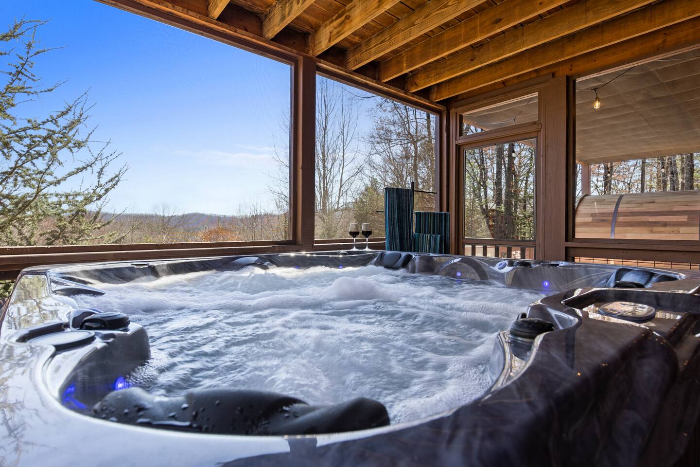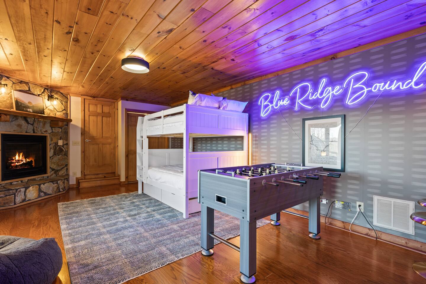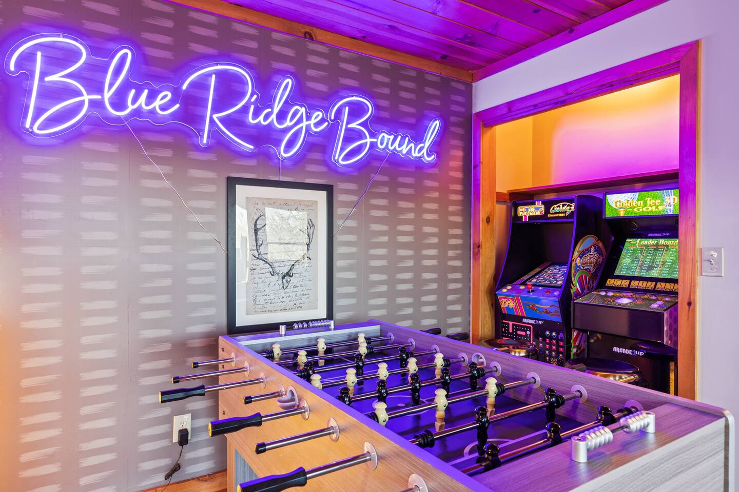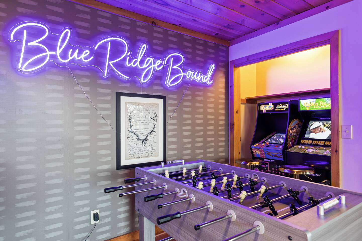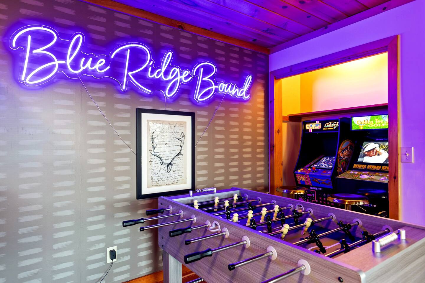 Located approximately 5 miles from downtown Blue Ridge, this cabin offers the serenity of nature and the convenience of downtown activities and restaurants. With its sauna, hot tub, and amazing views, this is the ultimate retreat for anyone seeking a serene escape, perfect for relaxing, rejuvenating, and reconnecting with nature and loved ones. Arcade and board games will provide hours of laughter and friendly competition for all. Enjoy s'mores at the firepit and watch the stars come out.